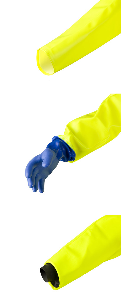 Grote wigsluiting. Verdekte sluiting met klittenband. Elastiek in rug. Capuchon met koord. Keuze uit: zoom, latexmanchet of aangelaste handschoen.
