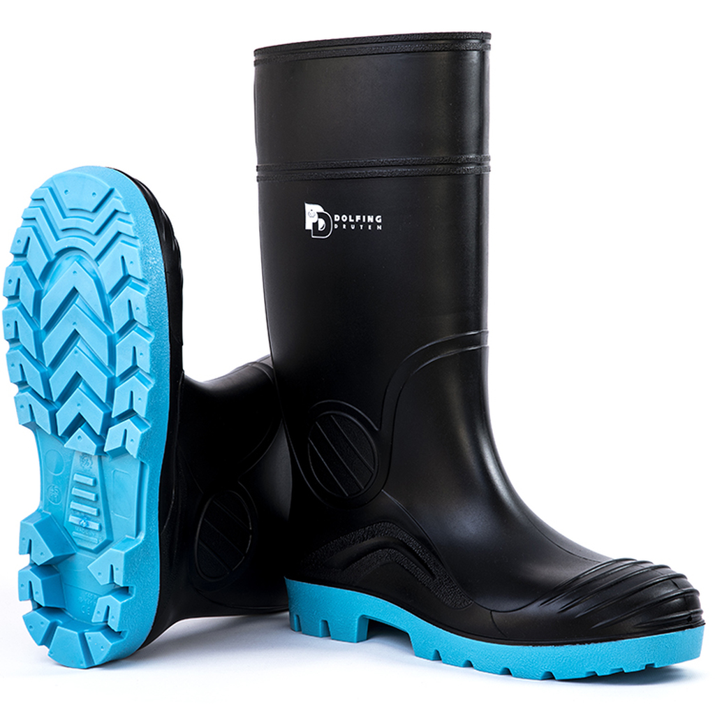 Bretels verlengd met elastiek. Gespsluiting. Versteviging in de knie. Binnenzak op borsthoogte. Waterdicht aangelaste Wellington PVC laarzen.