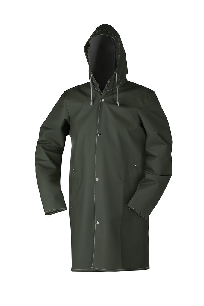 Getailleerde trenchcoat. Drukknoopsluiting. Capuchon met koord. Drukknopen op mouwen. Steekzakken.
